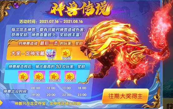 神兽传说破天降世,全新活动神兽传说上线,三形态超强白虎圣兽狂暴登场,狩猎白虎圣兽领亿万金币,在活动期间内,每次攻击神兽都有概率对神兽造成伤害,也有概率获得奖励,根据造成的伤害进行排名,对神兽造成伤害越高,奖励越丰富!神兽被击败后,输出最高的 10 位玩家以及对神兽造成最后一击的玩家还可以获得丰厚大奖哦!
