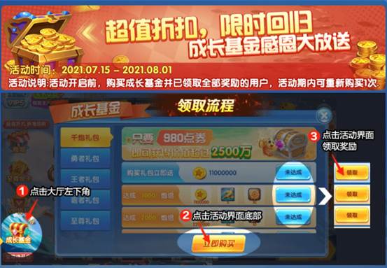 超值折扣,限时回归,之前购买过成长基金的小伙伴们,福利来啦!成长基金感恩大放送!清除历史限购,畅爽购买!活动开启前,购买成长基金并已领取全部奖励的用户,在活动期间内即可重新购买 1 次,机会不容错过哦!