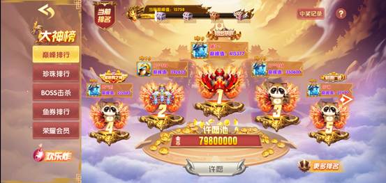 捕获任意鱼和充值都会增加巅峰值, VIP 等级越高巅峰分加成也越高,巅峰榜排名按照当天巅峰值进行排名,当天个人巅峰值达到一定积分时,即可领取相对应的金币道具奖励!根据游戏内获取的巅峰值进行排名,巅峰榜月榜排名第一的玩家可以领取超丰富的奖励哦!